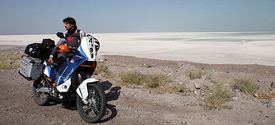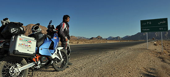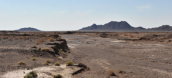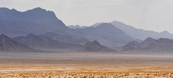 300 Kilometer südlich von Mashhad verschwindet plötzlich die eh schon spärliche Vegetation. Vor uns liegen 600 Kilometer Sand- Salz- und Geröllwüste. Weite, bis an den Horizont reichende Steinebenen, in denen es kaum Leben gibt, werden von bizarren braunen und schwarzen Gebirgszügen flankiert.