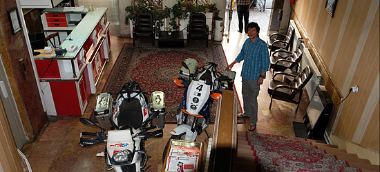 Hier ist es nicht das erste Mal, dass man uns erlaubt die Motorräder in der Hotellobby auf den riesigen persischen Teppichen zu parken.