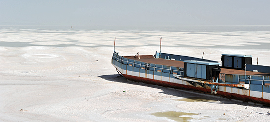 Auf einem Damm überqueren wir am folgenden Tag den Urmia-See, der bereits zu dreiviertel ausgetrocknet ist. Geblieben ist eine bis an den Horizont reichende Salzschicht und Wracks von Fährschiffen, die einst die Verbindung zwischen den Ufern herstellten.